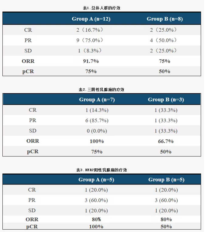 2017年9月至2019年3月,共纳入20例患者(阿帕替尼组,n=12;对照组,n=8)。阿帕替尼组和对照组患者pCR分别为75%、50%,ORR分别为91.7%、75%。在三阴性患者中pCR分别为75%、50%,ORR分别为100%、66.7%。在HER2阳性患者中pCR分别为100%、50%,ORR分别为80%、80%。1例SD患者出组。