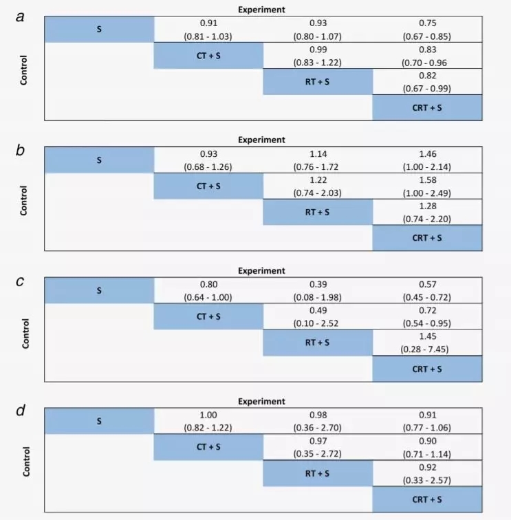 2018年发表于Int. J. Cancer一篇 Network meta分析[1]总结了不同类型辅助治疗之间的差异,纳入31项随机对照试验(截至2016.05),共计5496例患者,比较放化疗联合手术(CRT+S)、化疗联合手术(CT+S)、放疗联合手术(RT+S)以及单独手术(S)几种不同方案的有效性。1400例患者接受化疗联合手术,564例患者接受放疗联合手术,1150例患者接受放化疗联合手术,2382例患者单独手术。