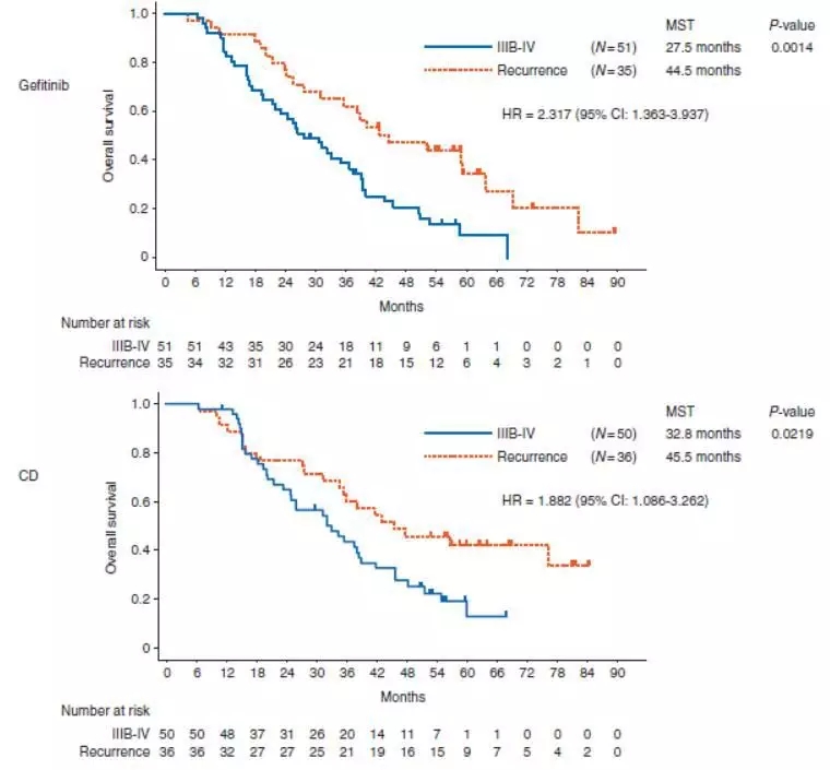 基于Cox比例风险回归的多因素分析中,在校正治疗方案、性别、年龄、吸烟状态、分期、是否术后复发、EGFR突变类型等因素后发现,术后复发的患者与较好的预后有关。在吉非替尼组,术后复发和非术后复发患者的中位OS分别为44.5个月和27.5个月(HR=2.317, 95% CI: 1.363–3.937, P=0.0014);而在化疗组,术后复发和非术后复发组的OS分别为45.5个月和32.8个月(HR=1.882, 95% CI: 1.086–3.262, P=0.0219)(图2)。