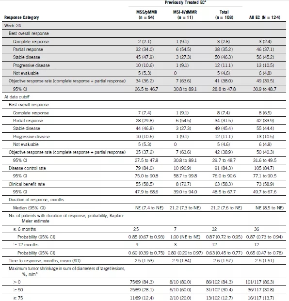 KEYNOTE-146/Study111是一项Ib/II期、开放标签、单臂试验,从2015年9月10日至2018年7月1日共招募了符合试验标准的108例晚期子宫内膜癌患者。给药方案为:乐伐替尼 20 mg, 口服,每日一次;帕博利珠单抗 200 mg,静滴,每三周一次。主要终点为ORRwk24;次要终点为ORR(客观缓解率)、DOR(缓解持续时间)、PFS(无进展生存期)、OS(总生存期)、DCR(疾病控制率)和CBR(临床获益率)。