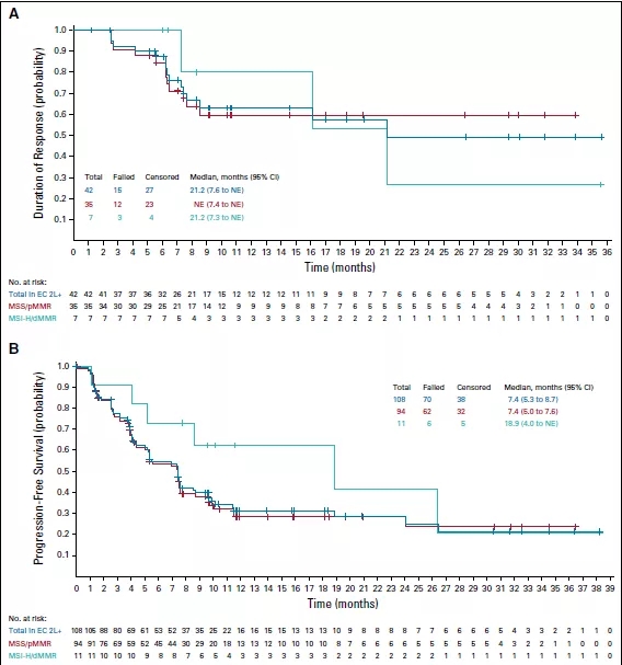 MSS/pMMR患者的ORR是37.2%(95%CI: 27.5%-47.8%),中位DOR NE(95%CI: 7.4个月-NE);MSI-H/dMMR患者的ORR达63.6%(95%CI: 30.8%-89.1%),中位DOR 21.2个月(95%CI: 7.3个月-NE)(图1)。