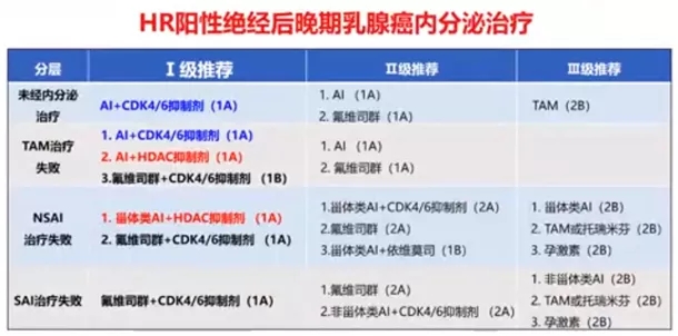 TAM治疗失败患者:AI/氟维司群+CDK4/6抑制剂由2019年的II级推荐上升为I级推荐(1A),新增AI+HDAC抑制剂为I级推荐(1A),第三个I级推荐是氟维司群+CDK4/6抑制剂(1B);II级推荐有AI(1A)和氟维司群(1A)。