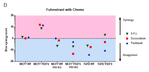 研究人员利用Bliss药物协同效应实验测试氟维司群与三种化疗药物(5-FU、阿霉素、紫杉醇)在MCF7、T47D、MCF7 Y537S、T47D Y537S细胞系以及MCF7 P53敲除细胞系中的药物相互作用,发现只有在P53野生型细胞中氟维司群与化疗具有药物协同作用,同时拥有Y537S突变的细胞系具有更高的协同效应分数,而无论P53突变还是P53敲除后,氟维司群与化疗均为拮抗作用(如图3)。