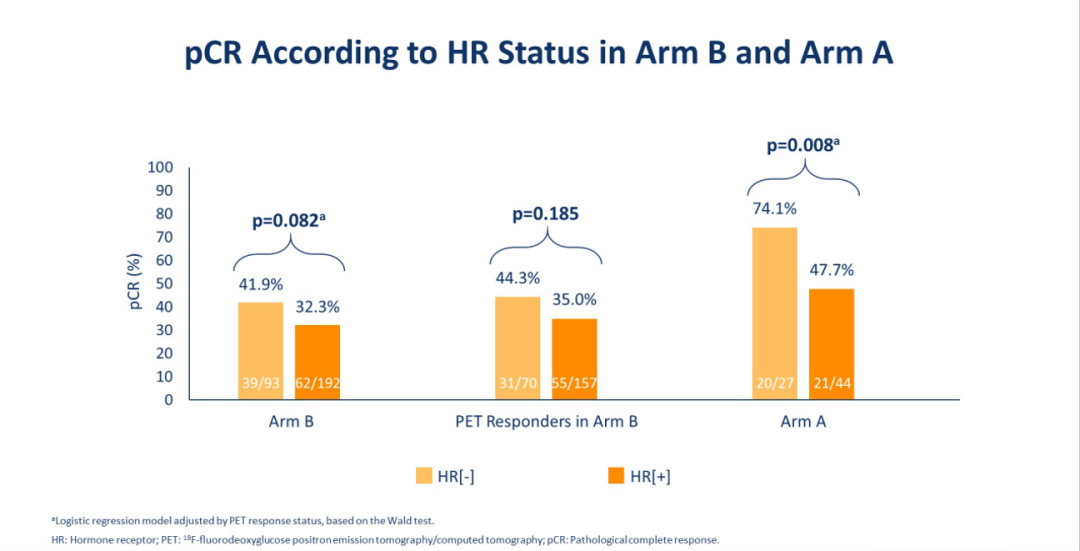 Prof.Cortes:我们不应该忽略哪些患者对PET检查的反应更好。ER-/HER2+患者对抗HER2治疗更敏感,因此,那些非HR阳性的患者反应更好,而这部分患者恰恰是可以进一步考虑去化疗的。在去化疗的B组(PH方案)患者中,ER阳性与治疗反应没有明显的相关性。但答案是非常清楚的,与ER阴性患者相比,ER阳性患者接受化疗的比例更高。我们需要更好地了解哪些患者不需要化疗,或许那些ER-,或者HER2IHC3+的患者更有可能对抗HER2治疗有反应,也更有可能用PET检查来评估疗效反应。