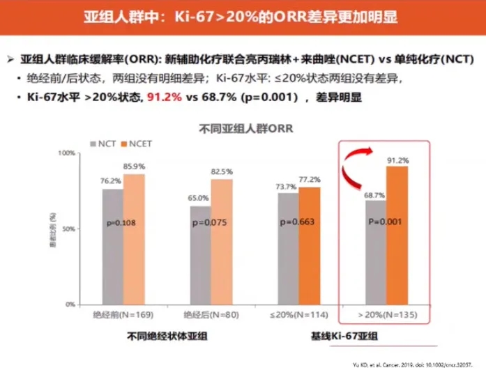 CBCSG-036研究中,249例HR+/HER2-可手术或局部晚期乳腺癌患者1:1随机分组,接受新辅助化疗或新辅助化疗+亮丙瑞林+来曲唑治疗,术后辅助治疗方案为来曲唑+亮丙瑞林(5年)。主要终点为临床缓解率(ORR),次要终点为Ki-67变化、病理学完全缓解率(pCR)、无进展生存(PFS)和安全性。处于绝经前的患者占68%,Ki-67≤20%占46%。研究发现,新辅助化疗联合内分泌组(亮丙瑞林+来曲唑)相比单纯化疗组可显著提高ORR,ITT人群的ORR分别为84.8% vs. 72.6%(P=0.019);Ki-67>20%亚组人群中,新辅助化疗+内分泌组的ORR显著提高(91.2% vs. 68.7%,P=0.001),而高临床缓解率有助于为后期手术创造有利条件。新辅助联合内分泌可显著降低Ki-67水平,ITT人群相对降低81.4%(P=0.001),而Ki-67下降与Luminal乳腺癌良好预后显著相关。Ki-67>20%亚组人群已显示PFS获益趋势,鉴于目前随访时间较短(26个月),ITT人群的PFS获益未来可期。