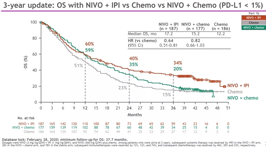 从2020 ASCO发布的CheckMate-227的3年随访数据可以看出,无论PD-L1表达阳性还是阴性,双免疫方案的获益均优于化疗。甚至,PD-L1<1%患者组从双免治疗中的获益度比PD-L1≥1%组更大。