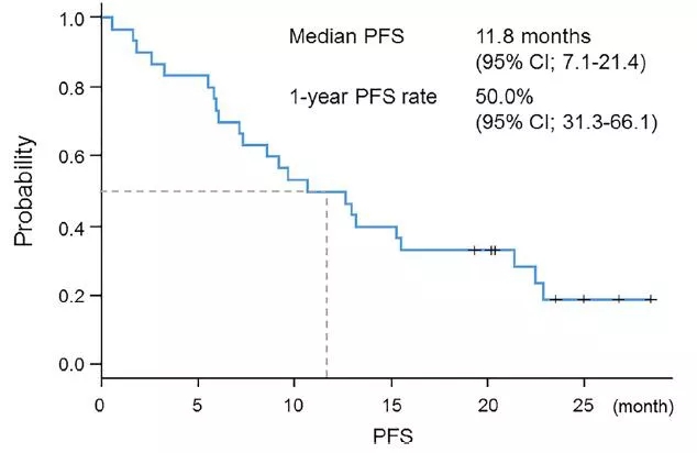 这项前瞻性研究共纳入30例符合入组标准的患者接受40mg起始剂量的阿法替尼治疗,当患者出现2度及以上不良反应或3度以上皮疹或其他不可耐受的毒性反应的时候,治疗剂量从40 mg降低为30 mg,如果有必要进一步降低为20 mg。研究的主要终点为1年PFS率,次要终点为PFS、ORR及安全性。