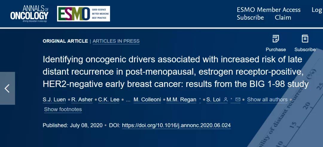 3.Luen SJ, Asher R, Lee CK, et al. Identifying oncogenic drivers associated with increased risk of late distant recurrence in post-menopausal, estrogen receptor-positive, HER2-negative early breast cancer: results from the BIG 1-98 study [published online ahead of print, 2020 Jul 8]. Ann Oncol. 2020;S0923-7534(20)39934-8. doi:10.1016/j.annonc.2020.06.024