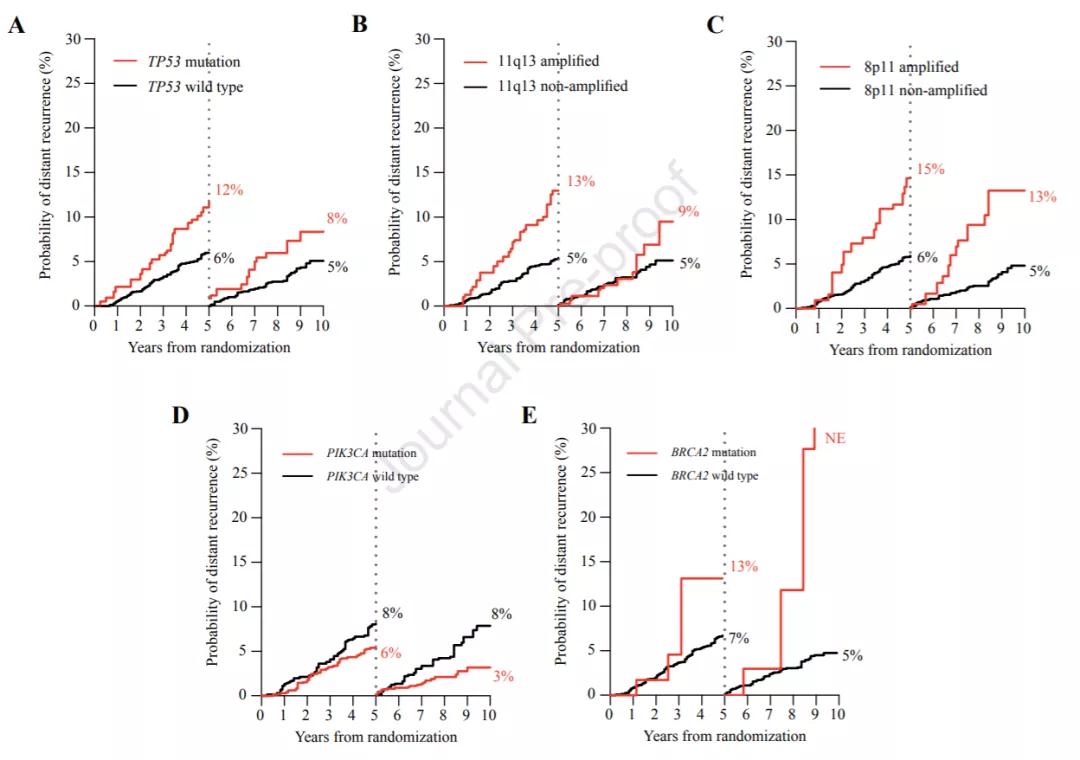 这项研究表明:在ER+/HER2-绝经后早期乳腺癌中,PIK3CA突变与远期远处复发的风险降低有关,而8p11扩增和BRCA2突变与晚期远处复发风险增加相关。肿瘤驱动因素改变的特征可能有助于改进远期疾病的治疗选择,并有助于确定未来试验中的潜在药物靶点。