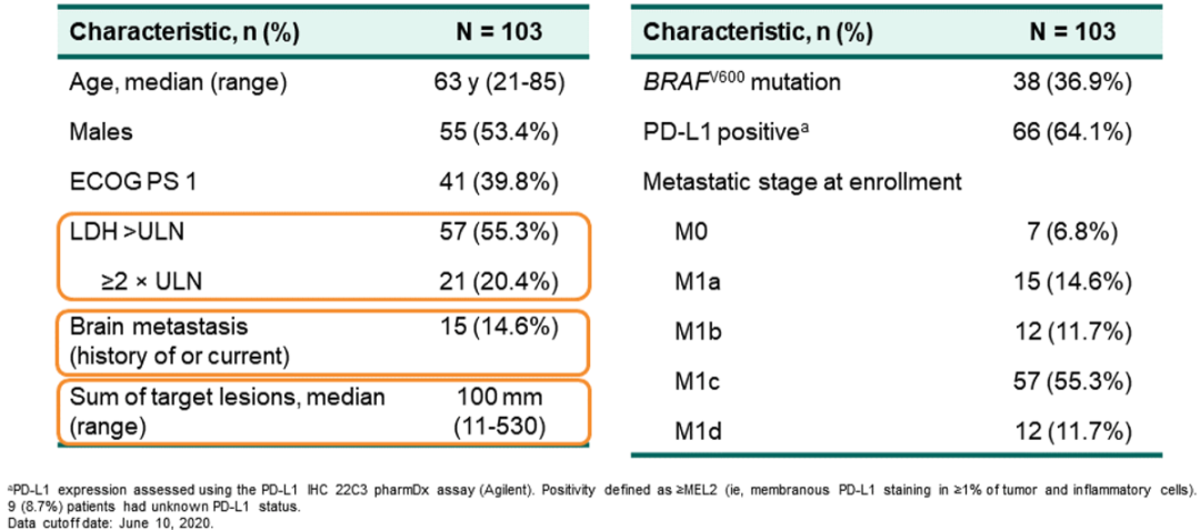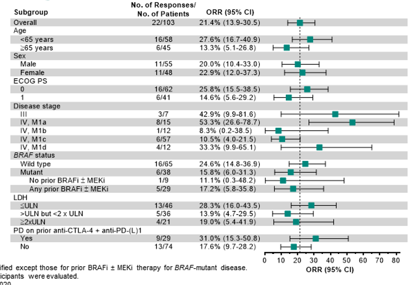 入组患者的主要条件:患者需最后一次接受PD-(L)1±CTLA-4的12周内确认疾病进展(iRECIST标准),接受≥2次PD-(L)1±CTLA-4的治疗(也是该研究对ICIs耐药的定义),控制≤25%的患者接受过PD-(L)1+CTLA-4,主要研究终点为客观缓解率(ORR)。从患者一般状态看LDH升高占55.3%(其中≥2xULN占20.4%),脑转移占15%,总体瘤负荷较大。62%患者接受过2线以上的全身治疗方案,最终入组患者中有28%患者接受过双免治疗。
