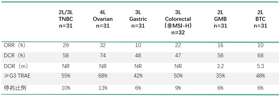 中位随访时间为8.6月(1.9-13.1m)。结果显示卵巢癌、三阴性乳腺癌的ORR约30%左右,结直肠癌ORR也达22%,研究最终每个瘤种入组100例左右。笔者作一大胆猜测,可乐组合将来有可能作为PD-1单抗耐药后的一种泛瘤种治疗模式进行申报。