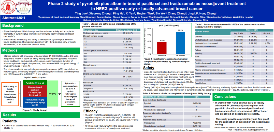 编者按:作为“国研之光”的小分子TKI吡咯替尼,其在晚期HER2阳性乳腺癌领域的疗效和安全性已获力证。随着抗HER2双靶治疗的研究和实践积累,吡咯替尼也将成为新辅助治疗领域富有潜力的新选择。在2020年ESMO大会上,四川大学华西医院罗婷教授报告的一项吡咯替尼联合白蛋白紫杉醇和曲妥珠单抗新辅助治疗HER2阳性早期或局部晚期乳腺癌的Ⅱ期研究,已取得了令人惊喜的结果。