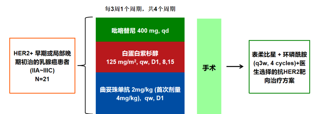 在这项开放标签的Ⅱ期临床研究中,入组患者均为初治的HER2阳性早期或局部晚期乳腺癌患者(临床ⅡA~ⅢC期),给予以下新辅助方案:吡咯替尼400 mg,qd;白蛋白结合紫杉醇125mg/m2,qw,D1/8/15;曲妥珠单抗2mg/kg(首次剂量4mg/kg) qw,D1;共4个周期(q3w为1个周期)。患者术后辅助治疗为4个周期的表柔比星+环磷酰胺+医生选择的抗HER2靶向治疗。研究主要终点为pCR (ypT0/Tis ypN0)。次要终点为ORR(RECIST 1.1)和安全性、耐受性等。