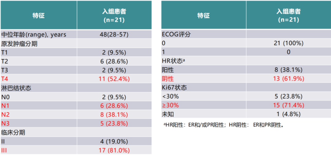 研究于2019年5月17日至2019年11月26日期间共入组了21例患者,中位年龄48 (28-57)岁,入组患者基线特征见表1。从表中可见,该研究入组患者大部分肿瘤负荷大,临床分期晚,复发风险高。其中T4期比例为52.4%(n=11),N1-3为90.5%(n=19),Ⅲ期为81.0%(n=17),HR阴性为61.9%(n=13),Ki-67≥30%为71.4%(n=15)。