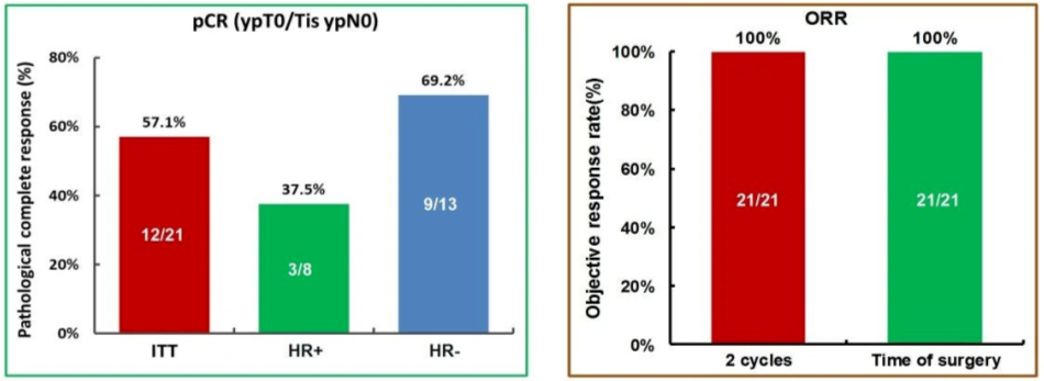 总体人群tpCR (ypT0/Tis ypN0)为57.1% (12/21),其中HR阴性亚组的tpCR在数值上明显高于HR阳性亚组(69.2% vs 37.5%,卡方检验P>0.05)。新辅助治疗2周期时,100%患者可达临床缓解;治疗结束时临床缓解仍持续,ORR为100%。