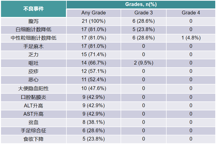 腹泻是最常见的不良事件(AEs),≥3级的发生率为28.6%,无4级腹泻发生,总体可控;≥3级中性粒细胞计数降低的发生率为33.3%,仅有1例(4.8%)患者为4级;无心脏毒性事件发生。