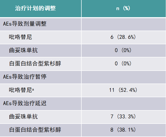 20例(95.2%)患者完成了所有新辅助疗程的治疗(仅1例患者因非AEs原因自行退出);因AEs导致吡咯替尼剂量调整的有6例(28.6%),因AEs导致吡咯替尼治疗暂停的有11例(52.4%),但累计暂停时间较短,中位累计暂停时间为7天(1-24)天;因AEs导致曲妥珠单抗和白蛋白紫杉醇治疗延迟的分别有7例(33.3%)和8例(38.1%),但治疗延迟考虑与白紫周疗引起的AEs相关。