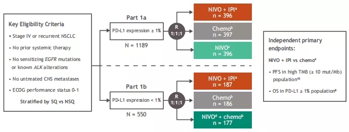 CheckMate-9LA是一项开放标签、多中心、随机III期研究,纳入ECOG PS 0-1且EGFR/ALK突变阴性的IV期/复发性NSCLC患者,旨在评估与单独化疗(4周期)相比,NIVO(360 mg Q3W)+IPI(1 mg/kg Q6W)+2周期化疗的疗效,主要研究终点为OS,次要终点包括PFS、ORR和基于PD-L1分层的疗效。今年ASCO大会上公布的结果显示,Nivo+ipi+2周期化疗可显著改善OS,2020年5月FDA依据该研究批准Nivo+ipi+有限化疗用于晚期EGFR/ALK阴性NSCLC一线患者(无论PD-L1表达)。