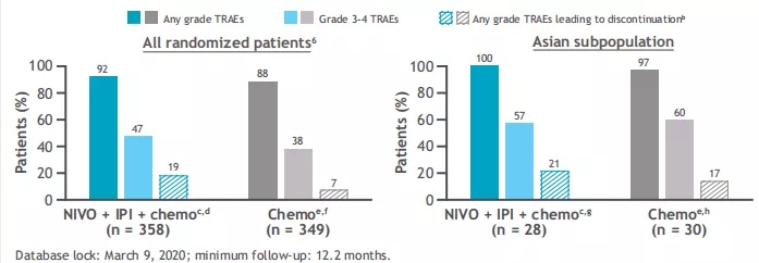本次亚洲亚组双免疫联合组没有观察到新的安全信号,Nivo+ipi在亚洲患者中的安全性与全球人群的既往报道一致。双免疫组和化疗组的任意级别治疗相关不良事件(TRAE)和3-4级TRAE的发生率相近,纳武利尤单抗联合低剂量伊匹木单抗治疗的安全性可控。