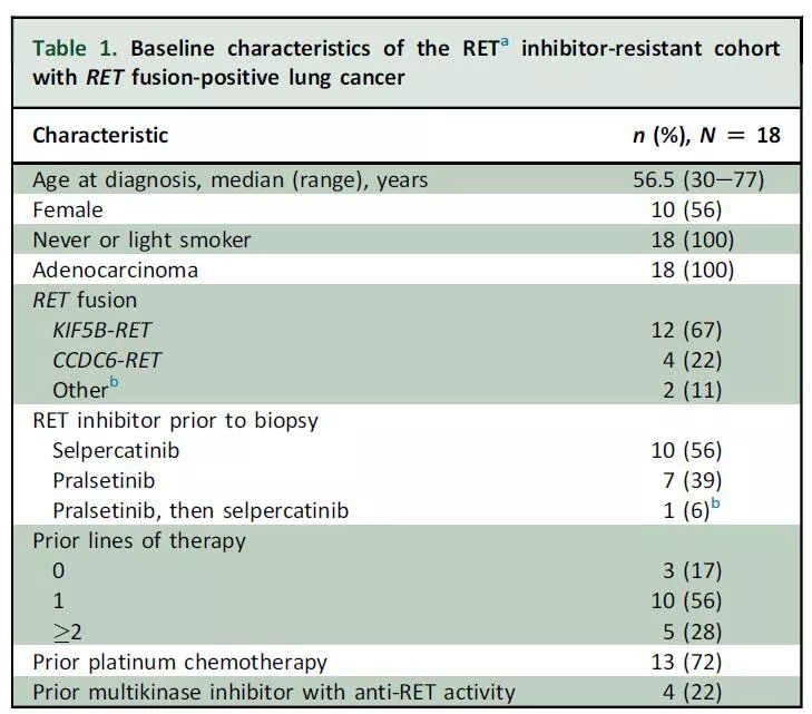 这是一项多中心、回顾性研究,共在美国5家研究中心进行,患者均为组织病理学或细胞病理学确认的转移性非小细胞肺癌,且携带RET基因融合,RET检测通过FISH、 DNA为基础的二代测序或RNA为基础的二代测序进行。患者耐药后,基于组织或液体活检进行二代测序,回顾性收集患者临床及分子病理特点。数据截止日期为2020年6月10日。