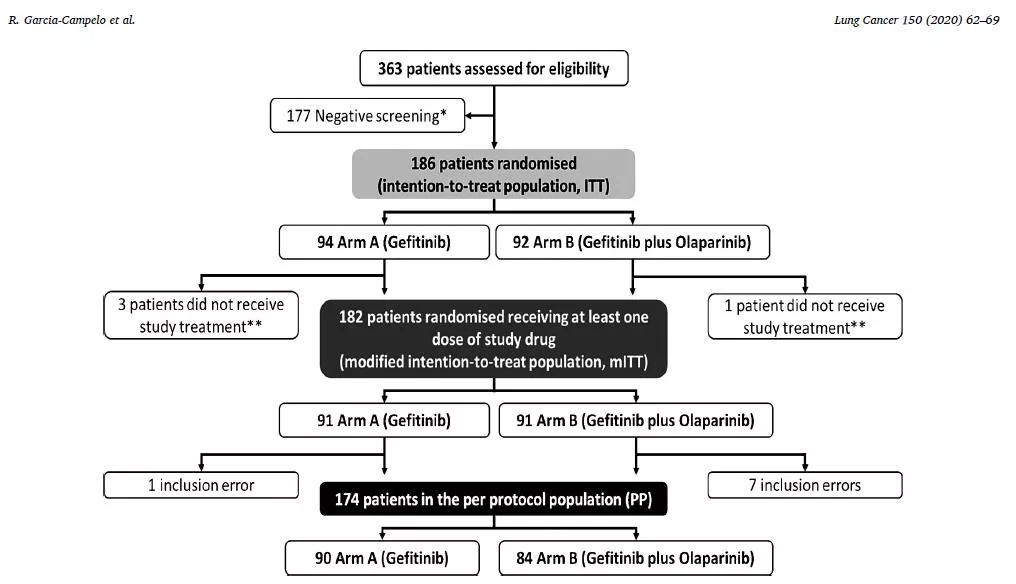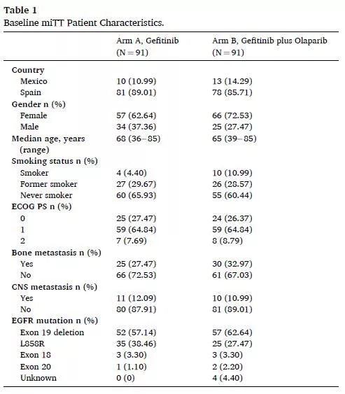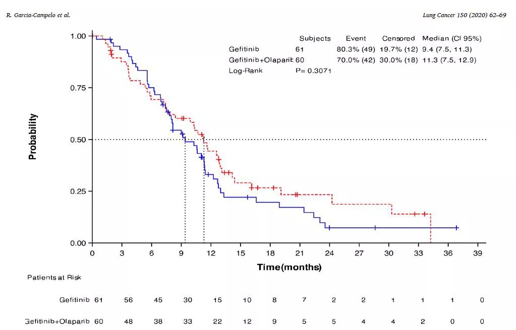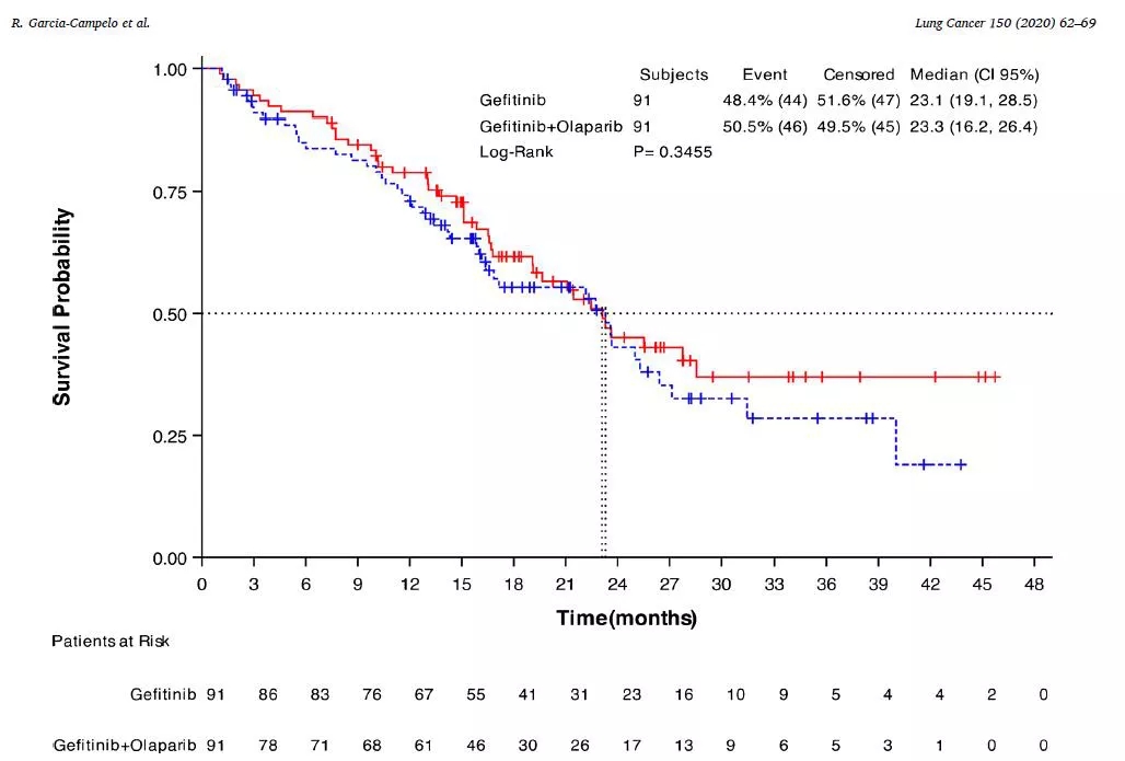 在Ib期临床研究中,我们已经确认了吉非替尼联合奥拉帕利是安全的,且两者之间不存在相互作用。后期的推荐剂量为吉非替尼250 mg,口服,每日一次,联合奥拉帕利200 mg,口服,每日三次。本文旨在报道研究的Part2部分结果。