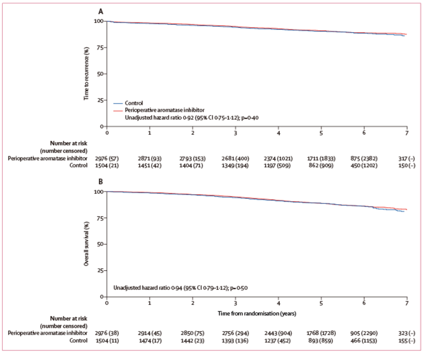 这项多中心、非盲、平行分组、随机对照3期试验,于2008年10月13日~2014年4月16日从英国130家医院入组了4480例患者。纳入患者为年龄≥50岁、WHO体力状态评分0~1分、绝经后女性、HR阳性可手术乳腺癌,按2:1随机分为POAI组(n=2976,术前2周,口服来曲唑2.5mg/天或阿那曲唑1mg/天)和对照组(n=1504)。主要终点为复发时间;次要终点为Ki-67≥10%或<10%与疾病结局的相关性。
