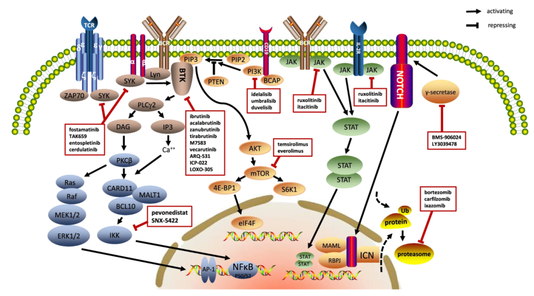 图1 :目前淋巴瘤信号传导途径和靶向药物