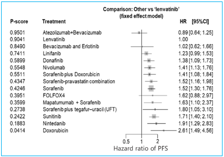 图2:晚期肝癌一线治疗的PFS比较,各研究方案按照P-score排序,HR值为每种方案与仑伐替尼相比的风险值