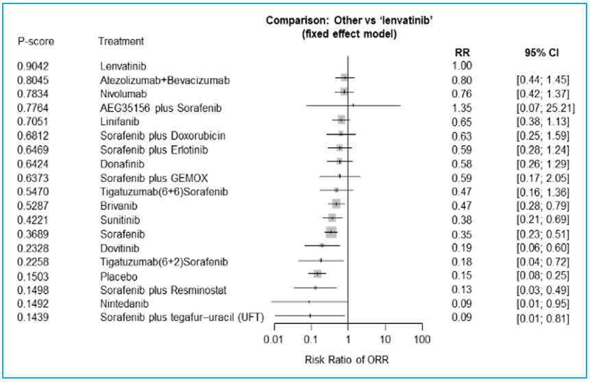 图3:晚期肝癌一线治疗的ORR比较,各研究方案按照P-score排序,RR值为每种方案与仑伐替尼相比的比值比