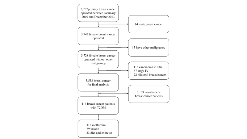 乳腺癌是全世界女性中最常见的癌症,是导致癌症死亡的第二大主要原因。随着医学科学的不断发展与进步,乳腺癌患者的预后得到了显著的改善,但合并症对乳腺癌预后的影响不容忽视。2型糖尿病是最常见的慢性疾病之一,影响着各个年龄段的人群,已成为全球公众日益关注的健康问题。许多研究发现乳腺癌与糖尿病之间存在关联性,而乳腺癌合并2型糖尿病更是严重影响女性的身心健康。