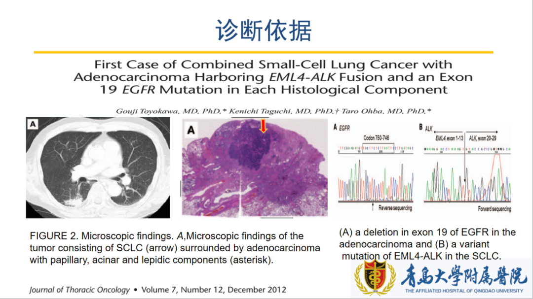而结合2012年胸外科杂志上的一篇关于《小细胞肺癌合并exon.19缺失以及ALK+案例报道》,我们倾向于患者为双肺双原发。