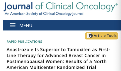 随机、双盲、多中心试验北美研究(the North American trial)显示,与他莫昔芬相比,阿那曲唑可显著延长至疾病进展时间(TTP,5.6个月 vs 11.1个月),并且阿那曲唑组发生血栓栓塞事件(4.1%v 8.2%)和阴道出血(1.2%v 3.8%)的患者较少[2]。研究结果于2000年发表在《Journal of Clinical Oncology》上。