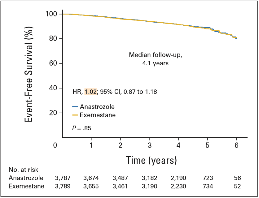 中位随访4.1年时,依西美坦与阿那曲唑在治疗激素受体阳性早期乳腺癌的EFS相当(HR 1.02,95%CI 0.87~1.18,P=0.85)。这意味着,研究未达到预期结果,并未证明依西美坦显著优于阿那曲唑。分层分析结果亦显示,无论淋巴结状态还是既往是否接受过辅助化疗,依西美坦组的EFS都不优于阿那曲唑组,同时次要终点OS和DFS也未见明显差异。