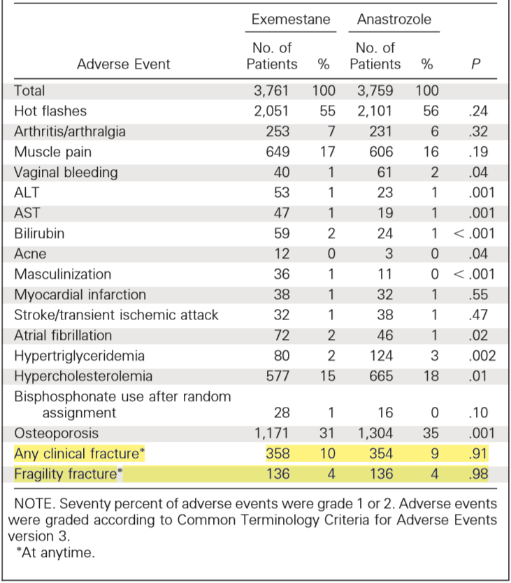 在后续的MA.27b研究中,纳入497例在MA.27随机后25周内接受双能X线骨密度仪扫描检测脊椎和髋部骨密度(BMD)的T评分的患者,以2年脊髓和髋部BMD的T评分变化为主要终点,无论是髋部还是腰椎两组患者T评分变化均未见显著差异。该研究结果进一步证实在骨关节事件上,阿那曲唑与依西美坦无明显差异。