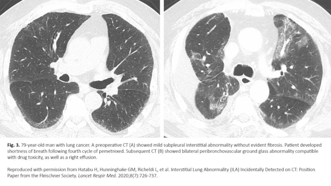 肺癌患者的ILA有两个方面需要考虑。首先,如前所述,大多数ILA会在肺癌筛查过程中被发现;第二个方面是ILA与肺癌治疗毒性和肺癌死亡率有关系。