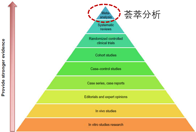 关于对研究证据进行分级的概念最早是在1979年,由加拿大定期体检特别工作组(CTFPHE)率先对研究证据进行分级并给出推荐意见。2001年,美国纽约州立大学下州医学中心推出了一个“证据金字塔”,也就是“新九级证据“。如图所示,循证金字塔从下往上分别是体外实验,动物实验、专家意见、病例报告、病例系列、病例对照研究、队列研究、随机对照研究、系统评价和meta分析。这些不同类型的研究其实是有不同的应用场景的,比如随机对照研究(RCT),尤其是3期的RCT是一种确证性的研究,它的证据级别是很高的,RCT也更多的是用于新药的上市申请和增加新的适应症申请;而队列研究更偏向于一些新的探索,包括新的联合方案或者适应症之外的其他肿瘤类型的疗效探索等等,去发现一些新的值得RCT进一步验证的信号和趋势。meta分析国内有的也翻译成荟萃分析,我们可以看到它是在这个金字塔的最顶端,是一种对多个研究结果进行收集、合并及统计分析的方法。meta分析一般是基于一个要解决的特定问题,将符合标准的所有研究结果进行汇总后分析,并给出相应的结果,这也是它为什么位于这个证据级别金字塔顶端,即meta分析的证据等级在所有研究类型中是最高的。