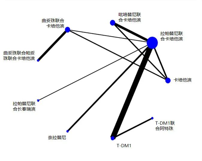 因此在临床实际工作中,对经曲妥珠单抗治疗出现进展的HER2阳性乳腺癌患者,医生会面对多种可选方案。目前每个研究都只是特定一种方案或两种方案的直接比较。对于每个特定的患者选择哪种治疗方案,并没有证据将多种方案进行汇总后的比较。我们做这个网状meta分析也是为了就这个问题给临床医生提供更多的信息参考。