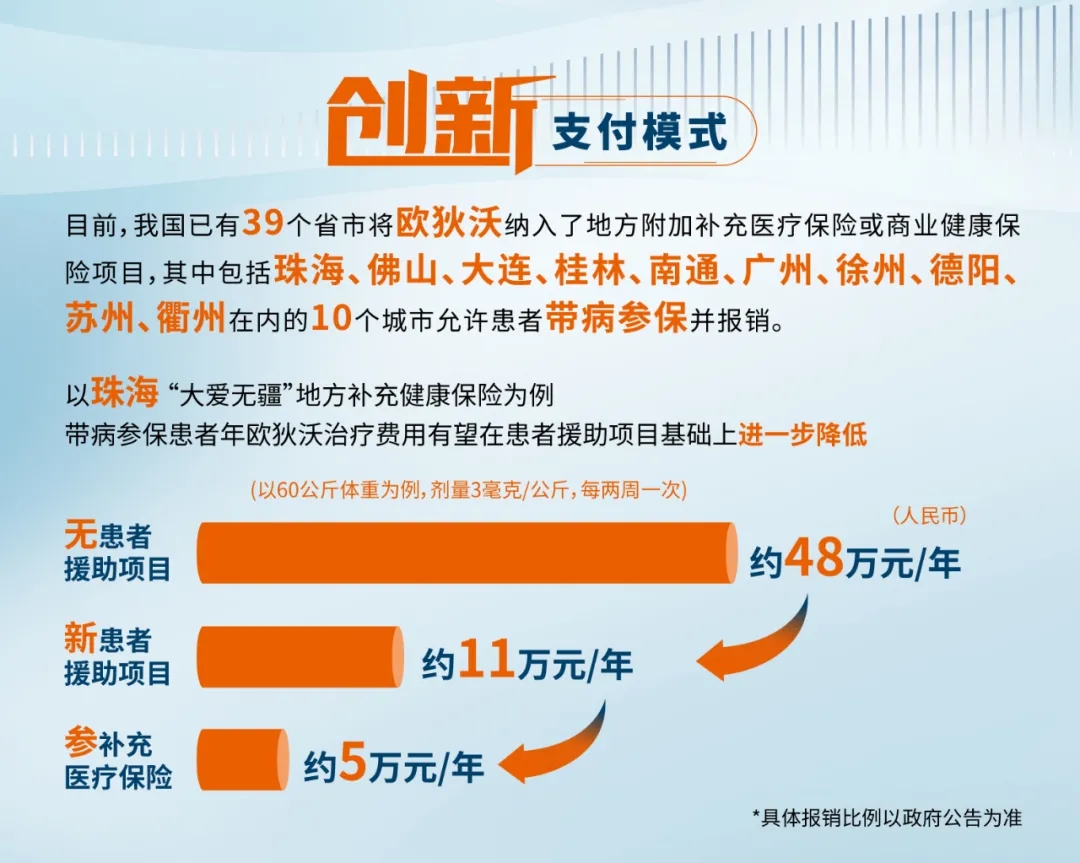 为了构建多层次的医疗保障体系,我国各地方政府积极探索创新支付模式,通过地方附加补充医疗保险和商业健康保险等模式,进一步降低患者治疗的经济负担。目前我国已有39个省市将欧狄沃纳入了地方附加补充医疗保险或商业健康保险项目,其中包括珠海、佛山、大连、桂林、南通、广州、徐州、德阳、苏州、衢州在内的10个城市允许患者带病参保并报销,未来还将进一步扩大。
