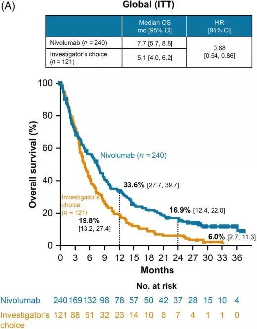 一项名为ATTRACTION-2的Ⅲ期临床研究证实了胃癌免疫治疗在东亚人群中的有效性及安全性,欧狄沃是首个且目前唯一经III期临床研究证实能为中国经两次或以上全身治疗晚期胃癌患者带来显著生存获益的PD-1抑制剂。2020年3月,纳武利尤单抗在中国被批准用于既往接受过两种或两种以上全身性治疗方案的晚期或复发性胃或胃食管连接部腺癌(GC/GEJ)患者,成为首个也是目前唯一在中国获批用于胃癌治疗的免疫肿瘤药物。ATTRACTION-2在493名中国台湾、日本和韩国患者对比纳武利尤单抗和安慰剂的疗效,研究结果证明了纳武利尤单抗相比安慰剂具有以下优势: