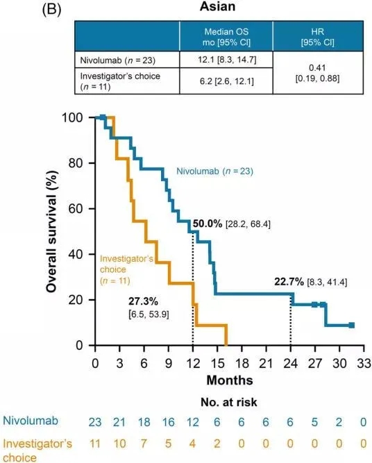 ◆ 亚洲患者的生存获益、药物安全性与整体人群一致:亚组分析明确了亚洲患者的获益,免疫治疗组有更长的生存期(mOS:12.1 vs 6.2个月),死亡风险下降59%。