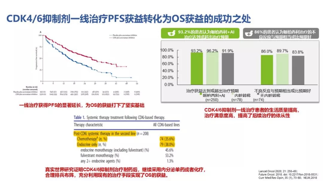 Tips:CDK4/6抑制剂一线治疗PFS获益转化为OS获益的成功之处,在于一线治疗获得PFS的显著延长,为OS的获益打下坚实基础;CDK4/6抑制剂一线治疗患者的生活质量提高,治疗满意度高,提高了后续治疗的依从性;真实世界研究证明CDK4/6抑制剂治疗耐药后,继续采用内分泌单药或者化疗,合理排兵布阵,充分利用现有的治疗手段实现了OS的获益。