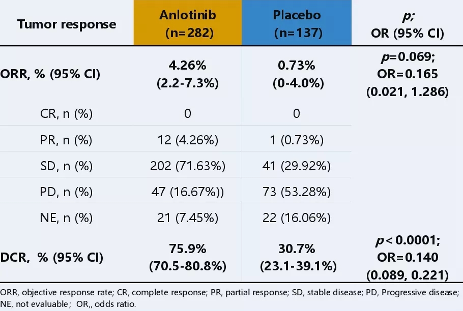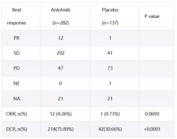 与安慰剂相比,安罗替尼可以观察到ORR和DCR的改善(图4)。