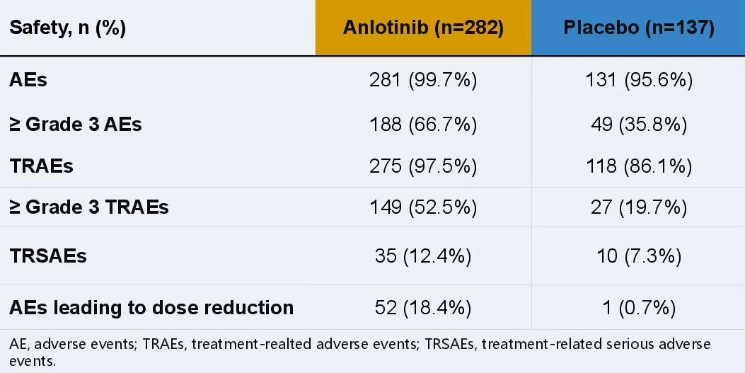 不良事件方面,52.5%的安罗替尼患者和19.7%的安慰剂组患者发生了3级或以上的治疗相关不良事件(TRAEs)(图5)。最常见的3级安罗替尼相关不良事件为高血压(20.9%)、γ-GT升高(7.1%)和手足综合征(6.4%),均通过减量恢复。安罗替尼组只有2例患者发生5级TRAE,均为出血。