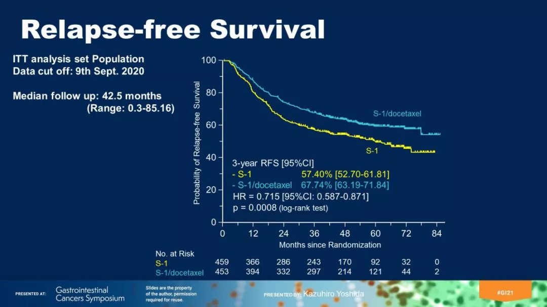随机对照GC-07试验第二次中期分析证实了Ⅲ期胃癌患者D2胃癌切除术后使用S-1+多西他赛对比单独使用S-1在无复发生存期(RFS)方面的优势,