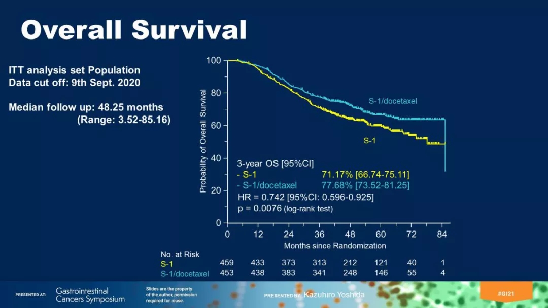 Kazuhiro Yoshida总结道,S-1+多西他赛被建议作为未接受新辅助化疗的病理Ⅲ期胃癌患者D2胃切除术后的辅助治疗。