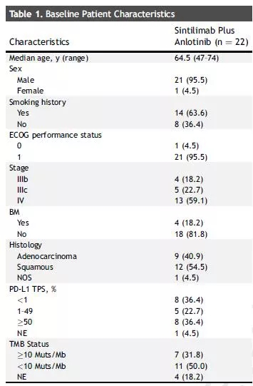 这是一项单中心、开放标签的Ib期临床研究。研究入组年龄18~75周岁、组织病理学或细胞病理学确认的局部晚期或转移性初治非小细胞肺癌患者。患者不携带EGFR、ALK及ROS1突变,PS评分0~1分。混合性小细胞肺癌、有症状的脑转移患者,有空洞的肺鳞癌以及有出血倾向的患者不允许入组。符合入组标准的患者,接受信迪利单抗(200mg固定剂量,每3周一次)联合安罗替尼(12mg,口服两周休息一周)治疗。在首先入组的10例患者中评估其安全性,若这10例患者出现不可耐受的不良反应(定义为持续时间超过7天的3度血液学不良反应、4度血液学不良反应或3度及以上非血液学不良反应),安罗替尼剂量将下调至10mg或8mg。治疗应当持续进行,直至疾病进展、出现不可耐受毒性反应或患者撤销知情同意。探索性分析研究了PD-L1表达水平及TMB与疗效的相关性。疗效每6周进行一次评估,评价为CR或PR的患者需在4周后进行疗效确认。疾病进展后,若研究者认为患者可以从治疗中继续获益,允许患者持续接受治疗。