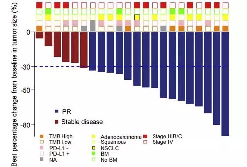 不同病例类型、PD-L及TMB水平和转移状态的患者均可以从这一治疗策略中获益。腺癌和鳞癌患者的ORR分别为88.9%和58.3%。IIIB-C期和IV期患者的ORR分别为66.7%和76.9%。PD-L1表达阳性和阴性的患者,ORR分别为69.2%和75%。TMB-High和TMB-Low的患者,ORR分别为85.7%和63.6%。4例基线有脑转移的患者中,3例患者系统评估为PR,颅内评估为CR。2例评估为PR的患者,响应仍然持续,1例评估为PR的患者,在治疗6.7个月后出现原发病灶进展。至数据分析时,基线无脑转移的患者均未出现新发脑转移病灶(图3)。