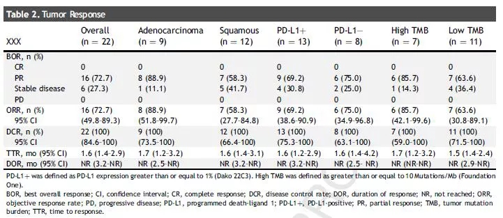 患者基线特点如下:95.5%的患者PS评分为1分,95.5%为男性,59.1%的患者存在远处转移病灶,分别有54.5%和40.1%的患者病理类型为鳞癌及腺癌,分别有4例患者和2例患者基线有脑转移及肝转移。在PD-L1及TMB可分析的患者中,59.1%为PD-L1高表达,31.8%为TMB-H。全组患者中位随访时间为15.8个月,数据分析时,9例患者仍然接受研究药物治疗(图1)。