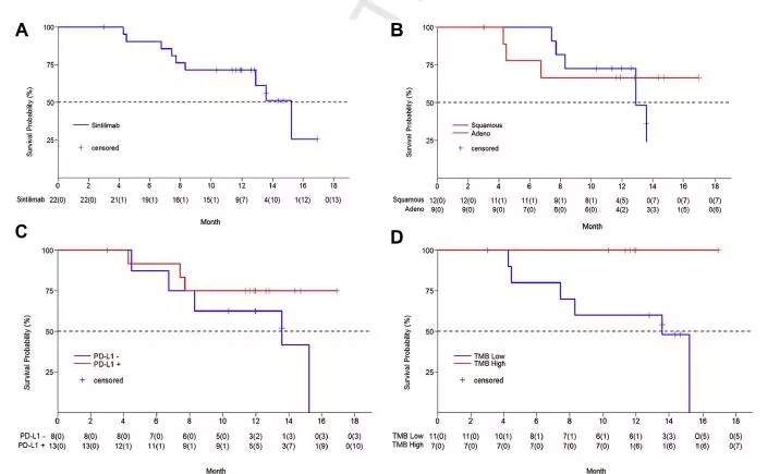 数据分析时,9例患者出现PFS事件。12个月PFS率为71.4%,中位PFS为15个月,鳞癌和腺癌的12个月PFS率相似,分别为72.7%和66.7%,中位PFS分别为13个月和未达到;IIIB-C期和IV期患者的中位PFS分别为15个月和14个月;PD-L1阳性和阴性患者的中位PFS分别为未达到和14个月,12个月PFS率分别为76.9%和62.5%。TMB-High的患者未出现疾病进展,而TMB-Low的患者12个月PFS率为60%(图4)。