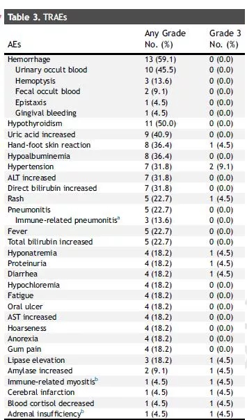 在首先入组的接受安全性评估的10例患者中,没有2度及以上不良反应发生率出现,因此所有后续患者安罗替尼剂量均采取12mg,在全部入组的患者中,22.7%的患者出现安罗替尼降低剂量,1例患者停止安罗替尼治疗,1例患者停止信迪利单抗治疗,1例患者停止两款药物治疗。所有患者均发生治疗相关的任何级别不良反应,最常见的为出血(59.1%)、甲状腺功能减低(50%)以及尿酸水平升高(49.9%)。其中,3度及以上治疗相关不良反应发生率为54.5%。最常见的血管靶向治疗有关的不良反应包括:出血(59.1%)、高血压(31.8%)和蛋白尿(18.2%),其中仅有1例患者出现2度尿潜血阳性而接受医学干预,没有3度及以上出血事件发生,也没有患者因出血事件而导致治疗中断。鳞癌及腺癌患者任何级别出血事件发生率相似,分别为66.7%和55.6%。